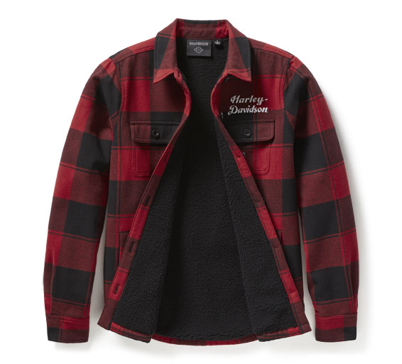 Tämä vuorattu takki yhdistää klassisen Harley-tyylin poikkeukselliseen mukavuuteen – täydellinen kylmiin päiviin. Pehmeä, harjattu puuvillatwilli, jossa on näyttävä ruutukuvio. Materiaalia 100% puuvilla ja vuori 100 % polyesteri-sherpa-teddyfleeceä. Napit edessä ja hihansuissa. Napitettavat rintataskut ja sivutaskuissa nepparikiinnitys. Brodeerattu Harley-Davidson-teksti rinnassa. Suuri brodeerattu B&S -logo selässä.